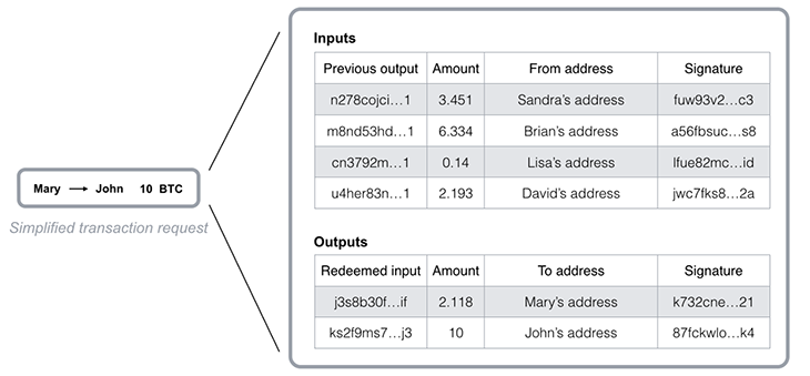 Các liên kết này được xem như là giá trị đầu vào, các nút trong mạng lưới sẽ xác minh xem tổng số tiền của các giao dịch này bằng hoặc vượt quá 10 BTC không. Tất cả điều này được thực hiện tự động trong ví điện tử của Mary và được kiểm tra bởi các nút trên mạng lưới Bitcoin, Mary chỉ gửi một giao dịch 10 bitcoin tới ví của John bằng khóa công khai của John.
