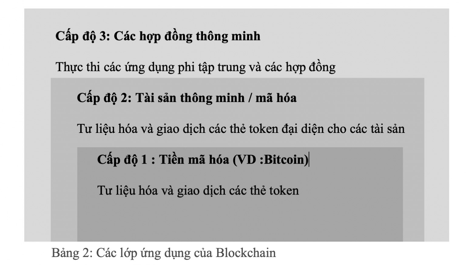 Tiền mã hóa là ứng dụng đầu tiên của công nghệ blockchain (xem Bảng 2). Chúng sử dụng các blockchain để ghi lại và chuyển các thẻ token kỹ thuật số không đại diện cho bất cứ điều gì. Cấp độ ứng dụng thứ hai là tài sản thông minh, trong đó, thẻ token đại diện cho các tài sản khác, có thể so sánh với chứng từ điện tử. Điều này làm cho nó có thể ấn định giá trị của các thẻ token đó vào các tài sản cơ bản. Cấp độ ứng dụng thứ ba bao gồm các hợp đồng thông minh trong đó thẻ token không chỉ đại diện cho các tài sản hoặc các quyền đơn giản. Hơn thế nữa, một blockchain sẽ lưu trữ phi tập trung và tự động thực thi các ứng dụng máy tính và các hợp đồng.