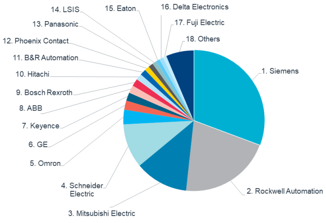Theo biểu đồ phân tích thị phần sản phẩm PLC mà các nhà sản xuất PLC nắm giữ đã được Interact Analysis thống kê (số liệu năm 2017, được thống kê năm 2018). Chúng ta thấy được rằng 3/4 thị trường PLC do các hãng Siemens, Rockwell, Mitsubishi và Schneider nắm giữ. Và qua đây, chúng ta đã có câu trả lời cho câu hỏi: PLC nào phổ biến nhất? hay Nhà sản xuất PLC nào nắm giữ nhiều thị phần sản phẩm PLC nhất?.