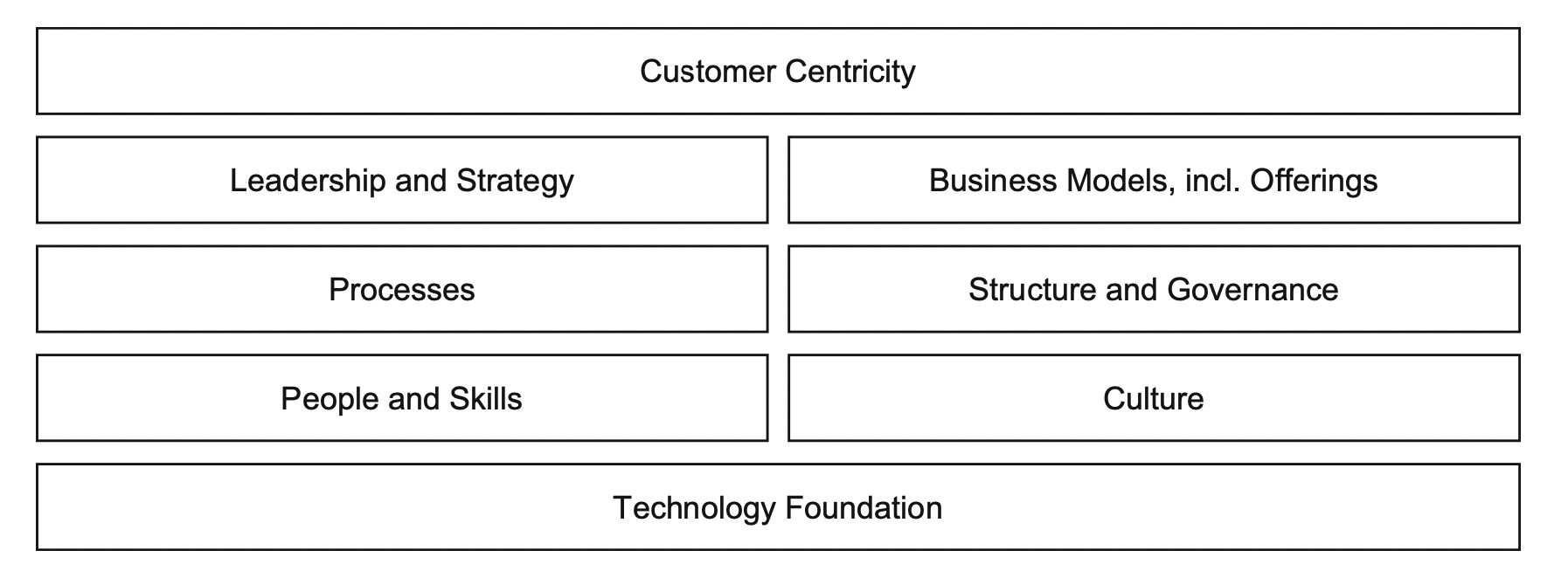 Chuyển đổi số là một chủ đề rộng đòi hỏi năng lực về chiến lược và tầm nhìn, con người và văn hóa, quy trình và quản trị, cũng như công nghệ và khả năng như hình dưới đây.