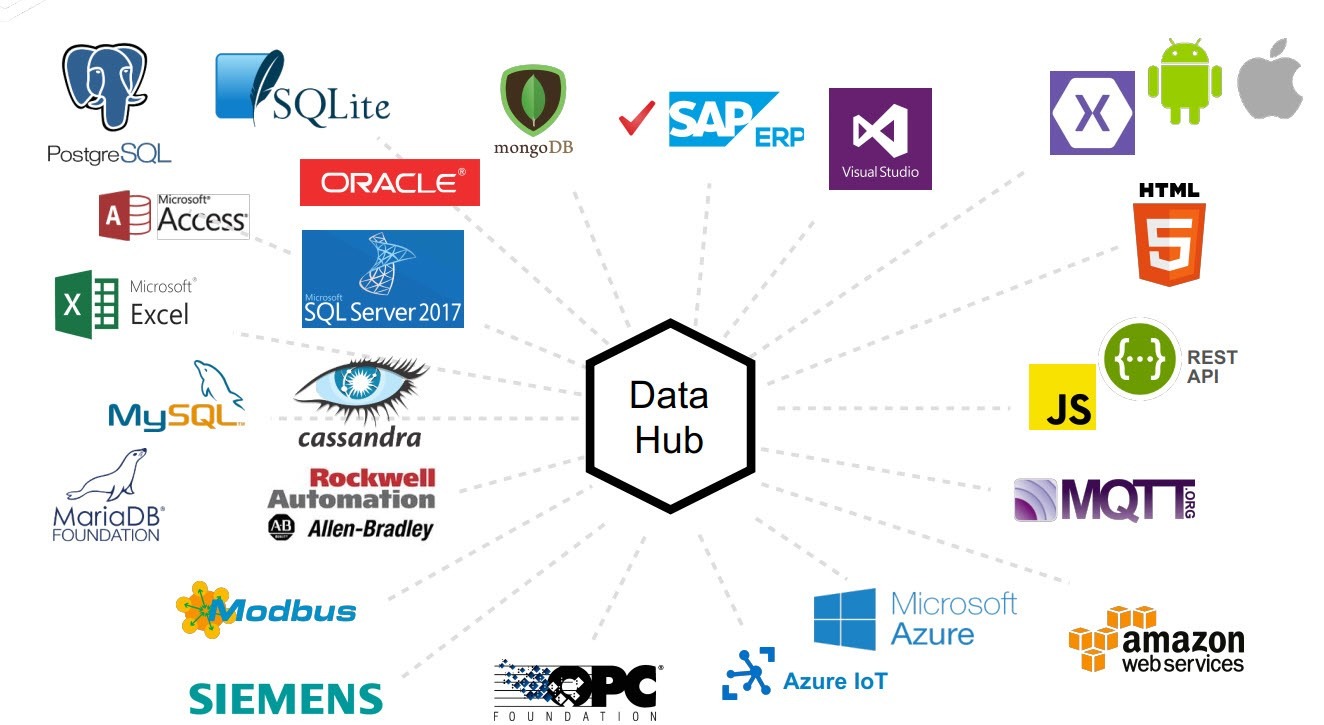 Một trung tâm tích hợp – Integration Hub mạnh mẽ sẽ có thể hoạt động với nhiều giao thức và định dạng tệp. Về phía OT, điều này bao gồm MQTT, OPC, TCP, JSON, XML, Hình ảnh, PDF, v.v. Và đối với các mối quan tâm về CNTT, điều này sẽ bao gồm Hàng đợi Thông báo (JMS và AMQP), REST, JSON qua các tệp HTTP, PTC / ThingWorx, CSV , SQL ODBC, SQL JDBC, v.v.
