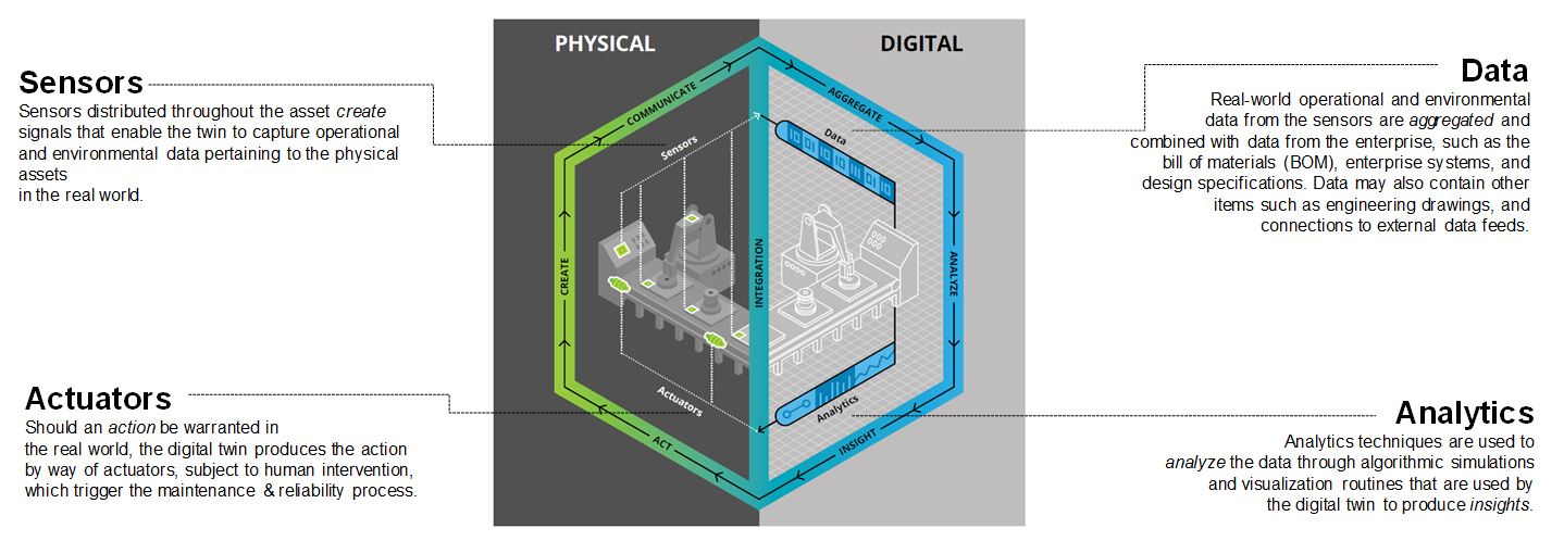 Trong hầu hết các định nghĩa, Digital Twin được coi là một đại diện ảo tương tác với đối tượng vật lý trong suốt vòng đời của nó và cung cấp trí thông minh để đánh giá, tối ưu hóa, dự đoán, v.v. Chúng tập trung vào cả hai mặt vật lý và ảo cũng như kết nối, đó là các yếu tố cần thiết trong khung ba chiều của Digital Twin.