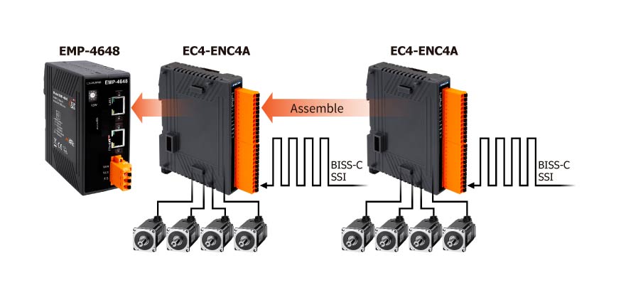 EC4-ENCxA also supports a maximum transmission frequency of 10MHz, a maximum transmission bit of 48bit(Including error bit, warning bit, CRC in BiSS-C mode), and Automatic compensation of cable delays in BiSS-C mode. The maximum cable length supported is 70 meters.