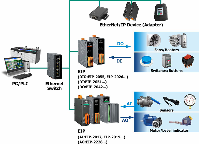 The EIP-2000 is an industrial remote I/O module series supporting the EtherNet/IP protocol. Users can seamlessly integrate these modules into the Ethernet network from the industrial floor to the enterprise. The EIP-2000 allows daisy chain connection which permits the flexibility in locating devices, eases installation and lowers infrastructure costs. All the modules can be deployed in the network topologies such as star, line or ring. The isolation design protects the EIP-2000 against the harmful interference. The EIP-2228 is an 8-ch AO module. It provides a variety of programmable analog output options (0 to 5 V, +/-5 V, 0 to 10 V, +/-10 V, 4 to 20 mA or 0 to 20 mA). With 2 Ethernet ports, the EIP-2228 allows daisy chain connection which permits flexibility in locating devices, eases installation, and lowers infrastructure costs. It features 4 kV ESD protection, 4 kV EFT protection, 2 kV surge, and 3000 VDC I/O isolation are also provided to enhance noise protection capabilities in industrial environments. The power-on value and safe value of AO are configurable. The Module is designed as an EtherNet/IP adapter. Users can obtain the output status as well as the connection status of the EIP-2228 by the LEDs indication. In addition, ICPDAS provides software utility to easily configure and test the EIP-2000 modules via Ethernet.