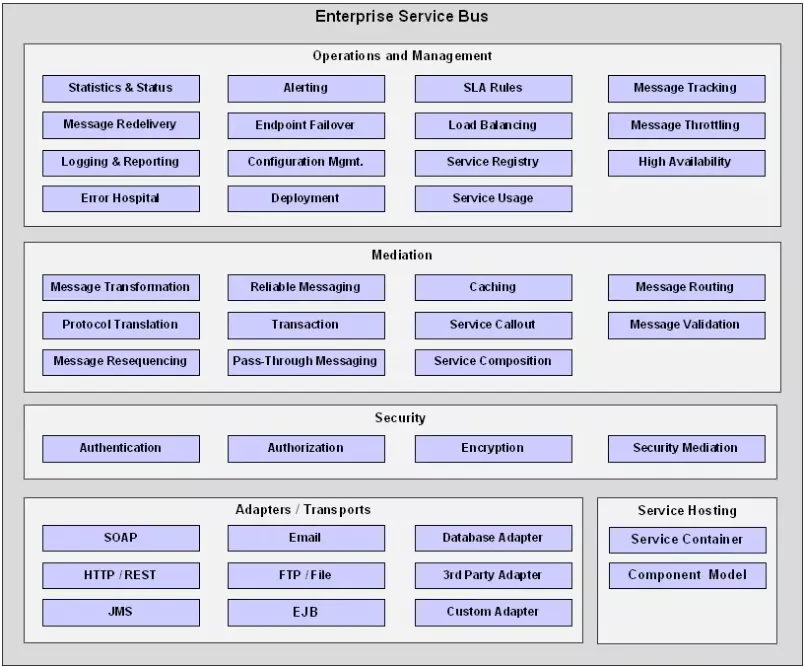 - Giao dịch (Transaction): Tương tự như khái niệm về Transaction của hệ quản trị cơ sở dữ liệu quan hệ, ESB cung cấp cho chúng ta sự toàn vẹn trong việc xử lý thông điệp. Nếu như trong luồng xử lý thông điệp, một tiến trình xử lý bị lỗi thì toàn bộ quá trình sẽ được huỷ bỏ và khôi phục về như ban đầu.