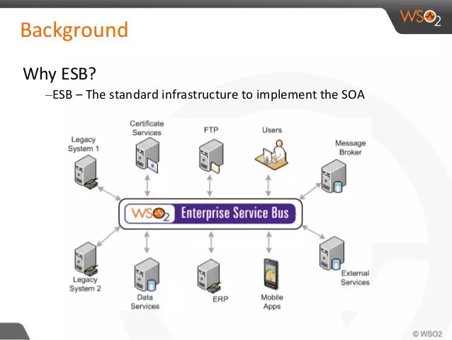 ESB là một công cụ phần mềm trung gian (middleware) phức tạp giúp tích hợp các thành phần, dịch vụ riêng rẽ thành một hệ thống và phân phối công việc giữa các thành phần, dịch vụ đó.