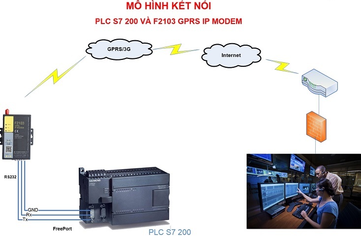 F2103 GPRS IP Modem sẽ kết nối với S7 200 qua chuẩn truyền thông RS232 ( nếu PLC của bạn chỉ hỗ trợ cổng RS485 thì bạn sẽ cần bộ chuyển đổi RS232 sang RS485). Ta sẽ cấu hình modem F2103 biết địa chỉ IP của server, nơi chứa phần mềm điều khiển và giám sát. Chỉ với 1 sim điện thoại bình thường có đăng ký GPRS hoặc 3G, bạn đã có một đường truyền vật lý thông suốt từ PLC về tới PC. Như vậy, giờ bạn chỉ cần ngồi ở trung tâm, có thể giám sát hoặc điều khiển hệ thống của mình được rồi.