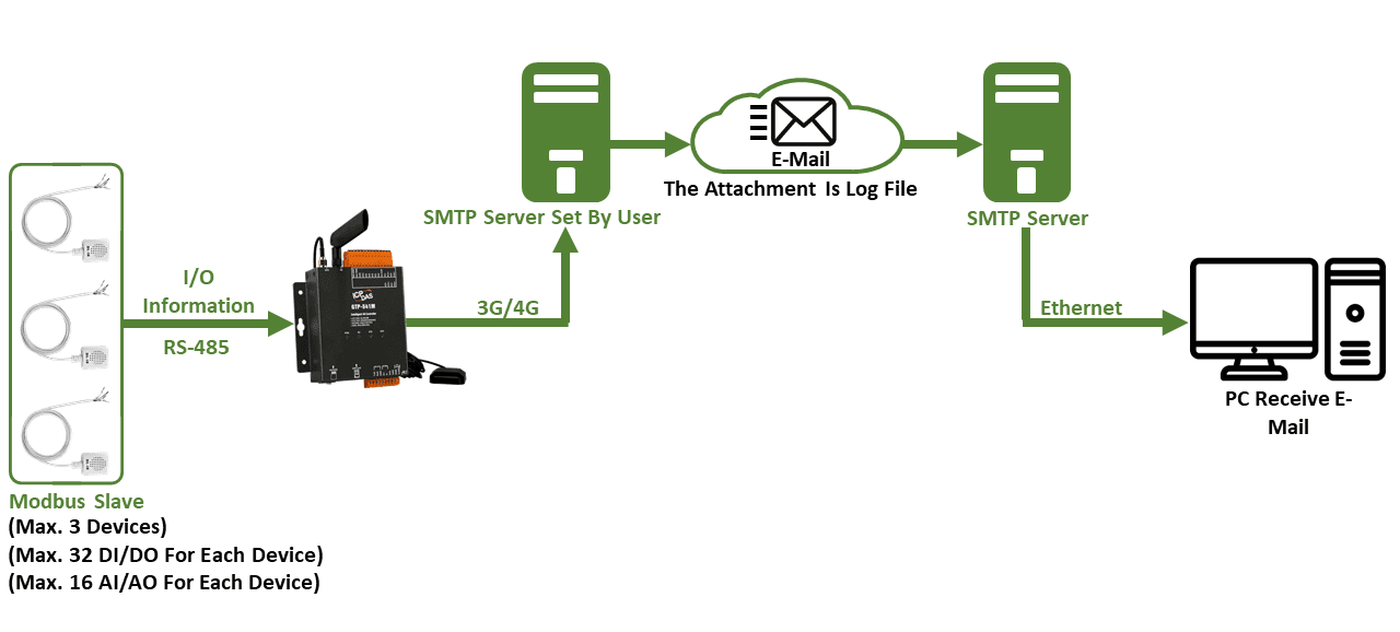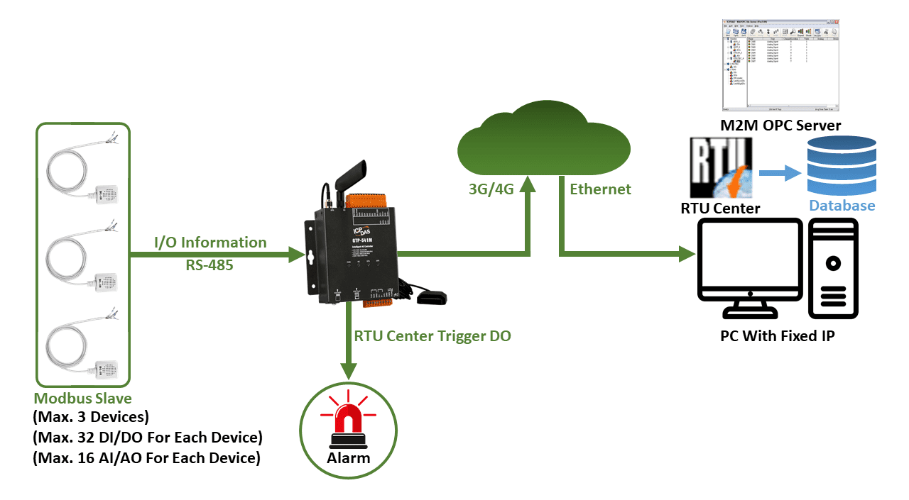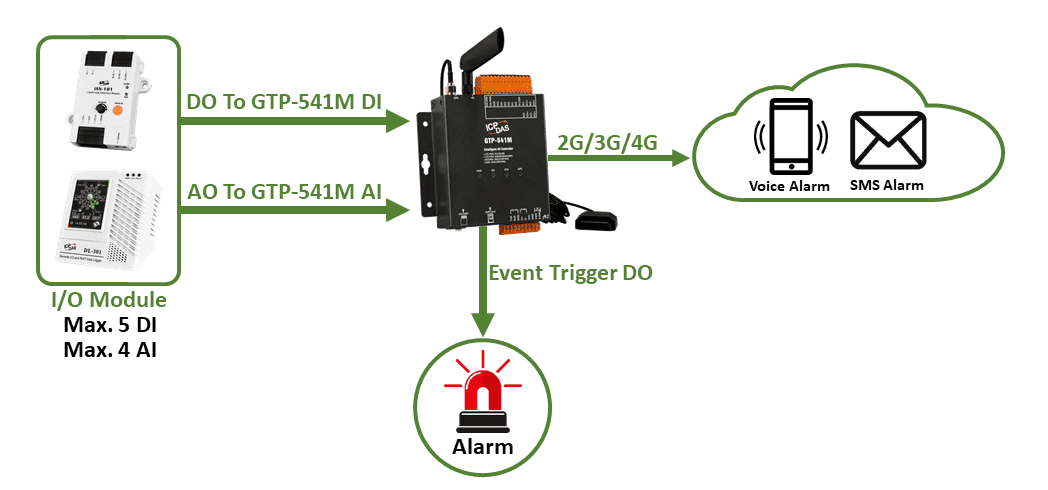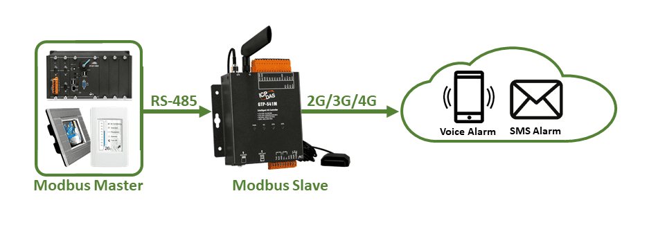 - Hỗ trợ giao tiếp với Modbus slave để kích hoạt SMS, cảnh báo bằng giọng nói hoặc DO tích hợp.