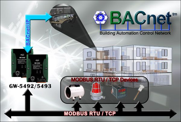 GW-5493 is a fully configurable universal Modbus RTU to BACnet/IP gateway. The GW-5493 includes BACnet/IP Server and Modbus TCP Client which is used to make Modbus TCP devices accessible on a BACnet network. BACnet (Building Automation and Control Networking) protocol has been designed specifically to meet the communication needs of building automation and control systems for applications such as heating, ventilating, air-conditioning control…etc. The GW-5493 contains a large number of BACnet objects (AI, AO, AV, BI, BO, BV, MSI, MSO, MSV) gives you flexibility in mapping Modbus RTU registers to any combination of BACnet objects. Multiple BIBBs (DS-RP-B, DS-RPM-B, DS-WP-B, DS-WPM, DS-COV-B…etc.) are supported. All the data transfer is configurable using a standard Web browser.