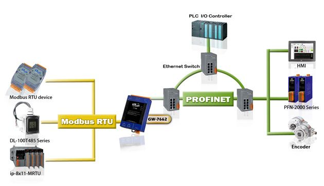 The GW-7662 specially designed for PROFINET IO device. It allows PROFINET controller to access Modbus devices. These Modbus devices maybe a PLC, a sensor, ICPDAS M-7000 series modules and so forth. We also provide a utility software for users to configure GW-7662. By using this module, users can put their Modbus devices into PROFINET network easily