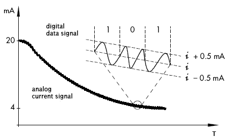 Giao thức HART (Highway Addressable Remote Transducer) sử dụng tiêu chuẩn Bell 202 Frequency Shift Keying (FSK) để chồng các tín hiệu liên lạc kỹ thuật số lên dòng điện vòng 4-20 mA như hình dưới đây. HART giao tiếp với tốc độ 1200 bps mà không bị gián đoạn và nhiễu với tín hiệu 4-20mA và cho phép ứng dụng máy chủ (chính) gửi / nhận thông tin kỹ thuật số từ một thiết bị trường thông minh.