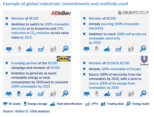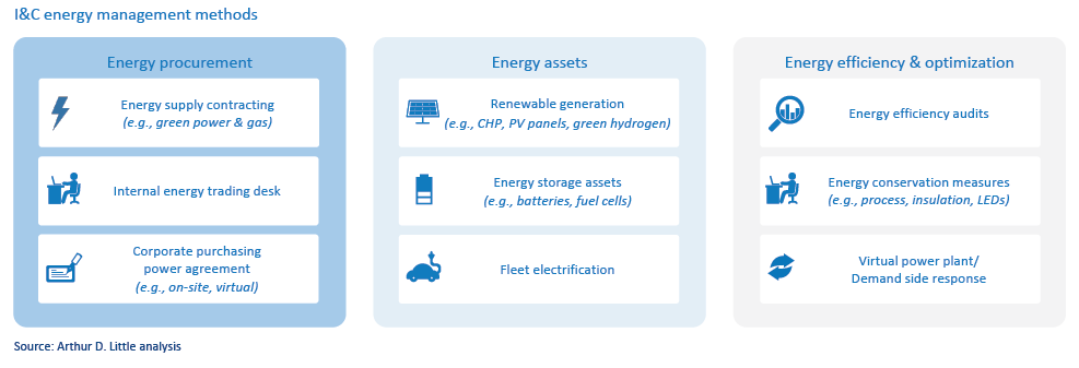 Các công ty phải suy nghĩ rộng rãi để giảm lượng khí thải của họ. Một danh mục quản lý năng lượng vững chắc xem xét tất cả các phương tiện giữa nhà máy điện và phích cắm – và phích cắm và sản phẩm. Trong những năm gần đây, quá trình chuyển đổi năng lượng phát triển nhanh chóng đã mở ra nhiều phương pháp, mô hình kinh doanh, tài sản và cơ hội mới khác nhau (xem hình dưới đây).