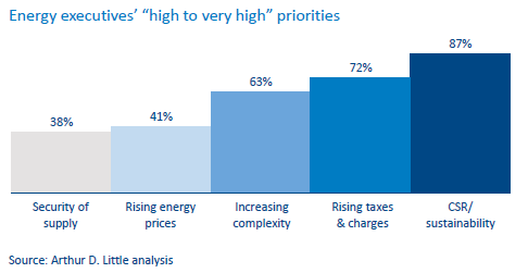 Tính bền vững của năng lượng thường cao trong chương trình nghị sự của các công nghiệp và các công ty thương mại lớn. Trong một cuộc khảo sát gần đây của Arthur D. Little giữa các nhà lãnh đạo ngành về các ưu tiên quản lý năng lượng, 87% giám đốc điều hành năng lượng đánh giá tính bền vững là mối quan tâm “cao hoặc rất cao” đối với công ty của họ (xem hình dưới đây). Họ báo cáo mối quan tâm này được kích thích thêm bởi áp lực của các bên liên quan, cũng như từ nhân viên, nhà đầu tư và khách hàng. Các tổ chức quan tâm cao nhất tiếp theo báo cáo giảm chi phí năng lượng tăng, bao gồm giá hàng hóa, thuế và phí lưới điện. Để đối phó với mối quan tâm này, các tổ chức thường đưa ra các mục tiêu và cam kết bền vững đầy tham vọng, cùng với việc xem xét các quyết định đầu tư như tài sản thế hệ phân tán.