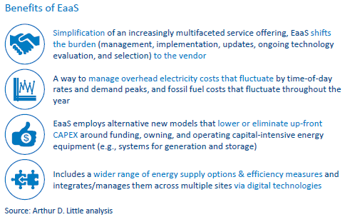 Có một số lợi ích cho mô hình EaaS, bao gồm đơn giản hóa việc cung cấp dịch vụ, tăng độ tin cậy lập kế hoạch chi phí, giảm hoặc loại bỏ CAPEX trước và bao gồm một loạt các tùy chọn dịch vụ năng lượng lớn hơn (xem hình dưới đây). EaaS có thể chứng minh là chìa khóa để tháo các bước tiếp theo cho các ngành công nghiệp trên con đường phát triển bền vững hiệu quả về chi phí.