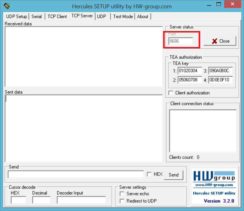 Trên máy tính, cần bật một chương trình để lắng nghe tại port đã mở ( ở đây là port 8686). Ta có thể sử dụng các chương trình đơn giản để lắng nghe như phần mềm Hercules như sau: