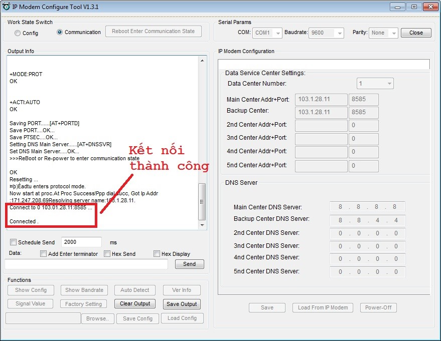 Khi có báo Connected như trên, là việc cấu hình kết nối từ modem F2103/F2403 về máy tính đã thành công. Từ lúc này, dữ liệu từ thiết bị cần điều khiển giám sát sẽ qua cổng RS232 của modem F2103/F2403 , qua hạ tầng mạng GPRS/3G, truyền về máy tính.
