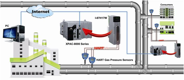 The XPAC-8000 controller and I-87H17W with eight HART AI channels are used to collect these HART manometers data quickly and easily. Through Ethernet, the control center can monitor all gas pipeline pressure remotely.