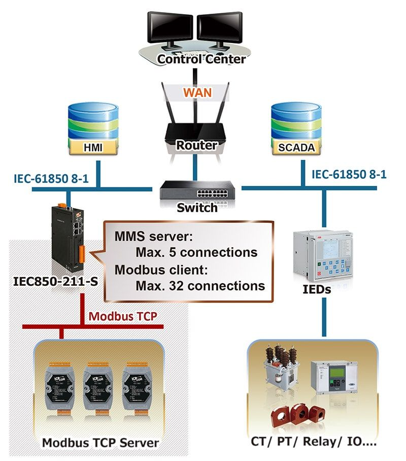 IEC850-211-S is a network gateway allowing IEC-61850 MMS client to access Modbus TCP network as a Modbus TCP client. IEC-61850 protocol is used in substation automation. The IEDs exchange information with other IEDs or SCADA via IEC-61850 protocol for protection and control devices. IEC850-211-S support Logical Node GGIO and Data Object Ind, IntIn, SPCSO, ISCSO. It also support data set and unbuffered report function to exchange data with a client. The data mapping rule can be configured via ICPDAS Utility.