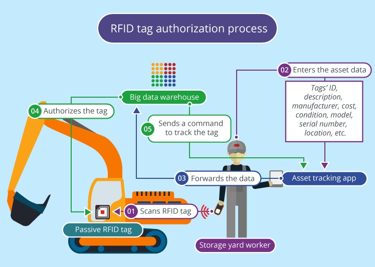 Dữ liệu này được lưu vào kho dữ liệu lớn – lưu trữ dữ liệu trên cloud – khi ủy quyền thẻ. Để ủy quyền thẻ, một nhân viên sân lưu trữ thiết bị sẽ quét nó bằng đầu đọc RFID cầm tay và nhập dữ liệu tài sản thông qua ứng dụng theo dõi tài sản. Ứng dụng theo dõi tài sản sẽ chuyển dữ liệu đến kho dữ liệu lớn, nơi bản ghi dữ liệu được lưu trữ với nhãn được ủy quyền. Khi thẻ được ủy quyền, phần mềm theo dõi tài sản sẽ nhận được lệnh theo dõi thẻ.