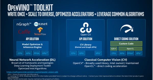 Intel cho biết bộ công cụ này nhằm vào các nhà data science và nhà phát triển phần mềm làm việc về thị giác máy tính, suy luận mạng thần kinh và triển khai Deep Learning, những người muốn tăng tốc các giải pháp của họ trên nhiều nền tảng, bao gồm CPU, GPU, VPU và FPGA. Điều này sẽ giúp các nhà phát triển đưa trí thông minh thị giác vào các ứng dụng của họ từ cạnh này sang đám mây khác.