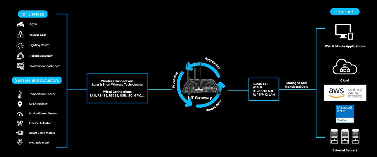 IoT Gateway đóng vai trò là cầu nối giữa các loại thiết bị IoT khác nhau và kết nối chúng với hệ thống dữ liệu trung tâm hoặc thậm chí là đám mây (Cloud). Logistics của dữ liệu truyền từ biên (rìa) đến Gateway và đến mạng bên ngoài như đám mây liên quan đến việc tổng hợp, phân tích và đồng bộ hóa dữ liệu. Các thiết bị IoT giao tiếp với IoT Gateway bằng kết có dây như LAN, RS-232, RS-485/422,.. hay sử dụng các công nghệ không dây tầm ngắn như Zigbee, Z-wave và Bluetooth LE. Một số thiết bị IoT cũng sử dụng công nghệ không dây tầm xa như LoRa, WiFi, LTE và LTE-M để giao tiếp với IoT Gateways. Sau đó, IoT Gateway kết nối với Wide Area Network (WAN) hoặc Đám mây thông qua cáp quang WAN hoặc Ethernet LAN.