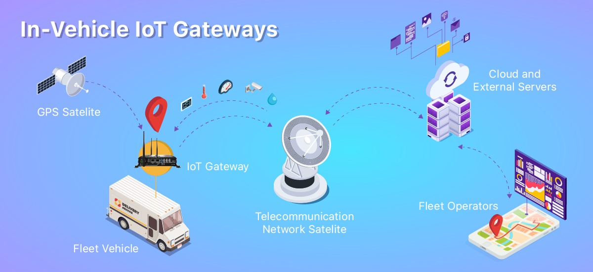 Các ứng dụng trong xe như quản lý, giám sát đội xe thường yêu cầu Cổng kết nối IoT để quản lý dữ liệu và thông tin thu thập từ các cảm biến và thiết bị IoT khác nhau. Dữ liệu và thông tin tổng hợp bao gồm vị trí GPS của xe, điểm đến, thông tin máy móc, thông tin đường bộ và các thông tin khác phụ thuộc vào nhiệm vụ của xe. Ví dụ xe đang gửi thực phẩm đông lạnh đến một địa điểm xa. Thông tin bổ sung có thể bao gồm nhiệt độ lưu trữ, hiệu suất bộ tản nhiệt và đồng hồ đo công suất để biết thời gian làm mát,… Tất cả những thông tin chi tiết này được thu thập và quản lý bởi Cổng kết nối IoT – IoT Gateways chỉ gửi thông tin quan trọng để cải thiện hiệu quả. Ví dụ: IoT Gateways chỉ gửi cảnh báo khi nhiệt độ lưu trữ giảm đáng kể thay vì liên tục truyền các thay đổi của nhiệt độ lưu trữ.