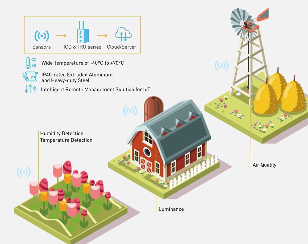 Có rất nhiều biến số cần được theo dõi và kiểm soát trong nông nghiệp thông minh. Nhiều loại thiết bị IoT, cảm biến và thiết bị truyền động khác nhau được lắp đặt xung quanh khu vực nông nghiệp để thu thập dữ liệu và thông tin quý giá về cây trồng và môi trường của chúng. Các cảm biến và thiết bị IoT này có thể thu thập thông tin như chất lượng đất, sự phát triển của cây trồng, bức xạ UV, độ ẩm và nhiều thông tin khác mà nông dân có thể sử dụng để đưa ra quyết định nhằm cải thiện sự phát triển của cây trồng. Cổng kết nối IoT cũng có thể được tự động hóa để điều khiển các thiết bị truyền động trên khu vực canh tác như phun phân bón và tưới cây dựa trên điều kiện thời tiết để tăng hiệu quả của phân bón và nước cho cây trồng.