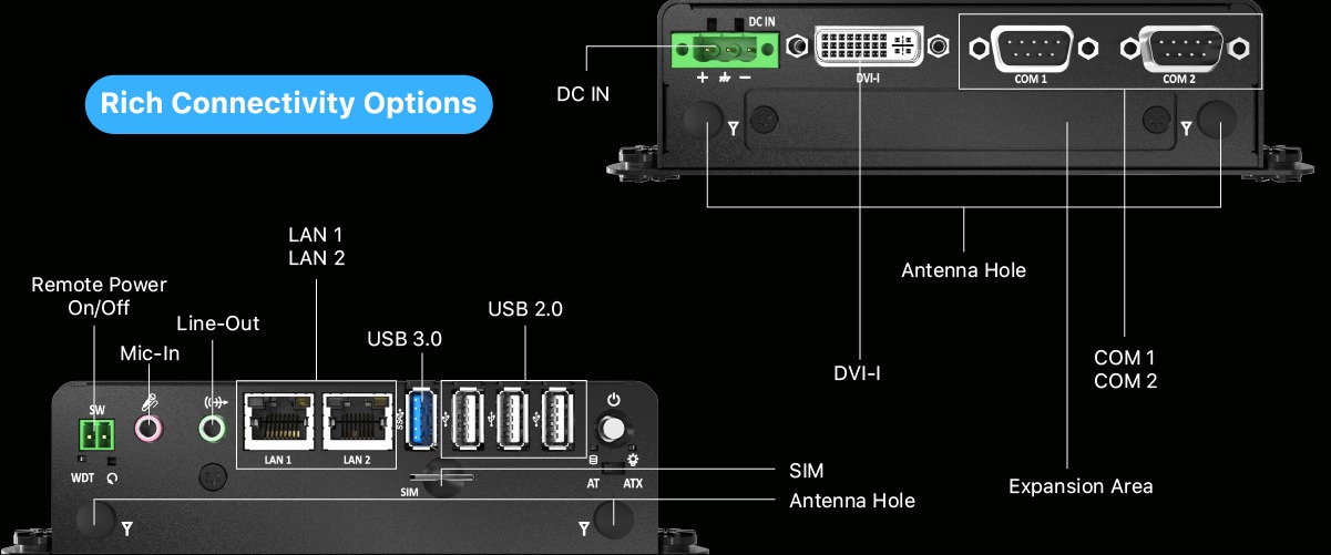 Cổng IoT công nghiệp được trang bị các tính năng kết nối không dây phong phú như 5G/ 4G (LTE), WiFi6, Bluetooth 5.0 và các tùy chọn kết nối có dây như RJ45 và M12 LAN với hỗ trợ PoE+. Chúng cũng hỗ trợ các tín hiệu tương tự như RS485, RS232, I2C, SPI, DIO, GPIO, v.v. để có được sự linh hoạt trong giao tiếp nhất.