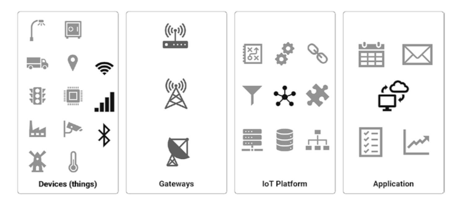 Ở cấp độ cao, chúng ta có thể xác định các giải pháp IoT bao gồm bốn khối chức năng chính.