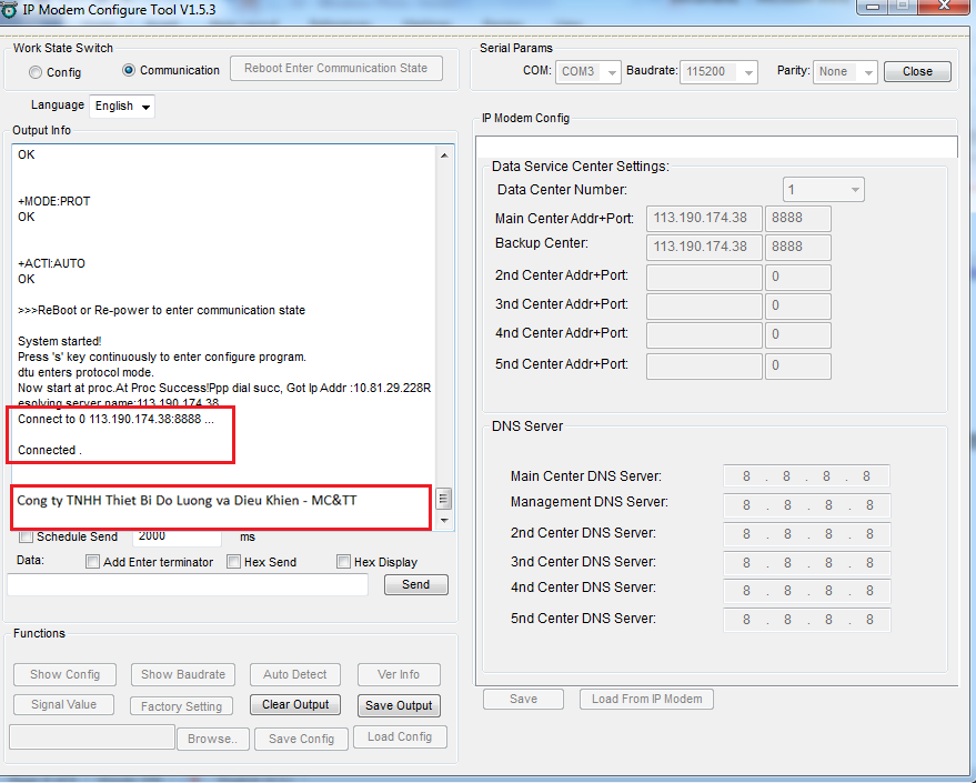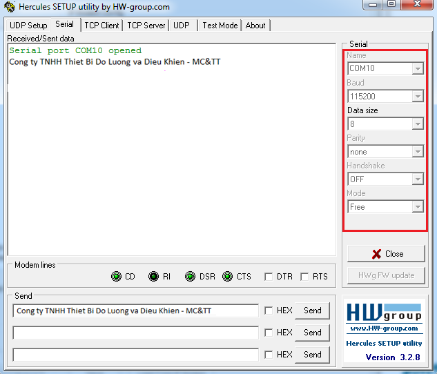 Kết quả là ta đã truyền và nhận được chuỗi ký tự: “Cong ty TNHH Thiet Bi Do Luong va Dieu Khien – MC&TT” từ cổng COM 10 về modem.