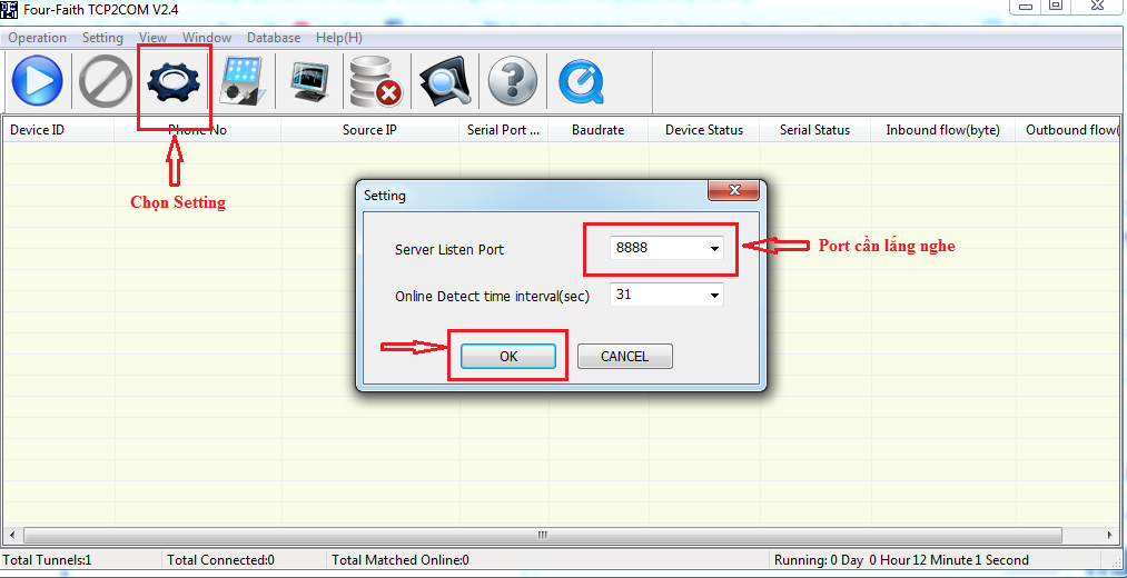 3.Chọn biểu tượng hoặc Setting trên thành công cụ để cài đặt Server Listen Port :