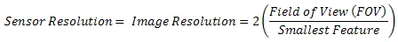 Để thực hiện phép đo chính xác trên hình ảnh, bạn cần sử dụng tối thiểu hai pixel cho mỗi điểm nhỏ nhất mà bạn muốn phát hiện. Để thực hiện tính toán cho độ phân giải cảm biến tối thiểu, hãy nhân hai (pixel/đối tượng nhỏ nhất) với kích thước (theo đơn vị trong thế giới thực) của FoV chia cho kích thước của đối tượng nhỏ nhất như được hiển thị trong phương trình sau: