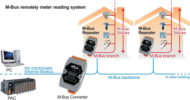 M-Bus (“Meter-Bus”) là một tiêu chuẩn châu Âu để đọc từ xa đồng hồ đo gas, đồng hồ nhiệt hoặc các đồng hồ điện khác. Bus này đáp ứng các yêu cầu đặc biệt của hệ thống từ xa hoặc chạy bằng pin, bao gồm đồng hồ tiện ích tiêu dùng, cảm biến và bộ truyền động khác nhau. Khi được thẩm vấn vào hệ thống mạng, các đồng hồ đo sẽ cung cấp dữ liệu đo được cho một tổng thể chung, ví dụ, có thể là một máy tính cầm tay, được kết nối theo các khoảng thời gian định kỳ để đọc tất cả các đồng hồ tiện ích của tòa nhà. Một phương pháp khác để thu thập dữ liệu tập trung là truyền các số đọc của đồng hồ qua modem.