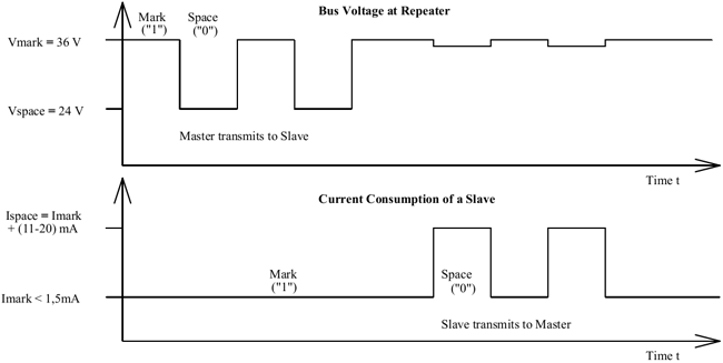 Logic “1” (Mark) tương ứng với điện áp +36 V ở đầu ra của trình điều khiển bus (bộ lặp), là một phần của bản gốc; khi một logic “0” (Space) được gửi, bộ lặp sẽ giảm điện áp bus 12 V xuống mức +24 V ở đầu ra của nó. Các bit được gửi theo hướng từ nô lệ đến chủ được mã hóa bằng cách điều chỉnh mức tiêu thụ dòng điện của nô lệ.