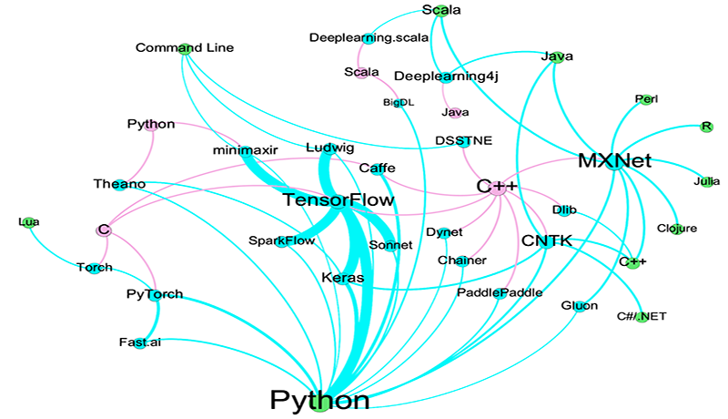 Ở đây, một bản tóm tắt đơn giản về các công cụ nguồn mở cho học sâu. Mạng lưới có ba loại nút. Công cụ học sâu có màu xanh lam. Các ngôn ngữ được sử dụng để phát triển các công cụ đó có màu hồng. Các APIs ( Applications Programming Interface) mà các nhà khoa học dữ liệu tận dụng khi sử dụng các công cụ đó có màu xanh lá cây.