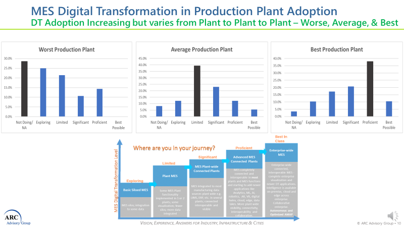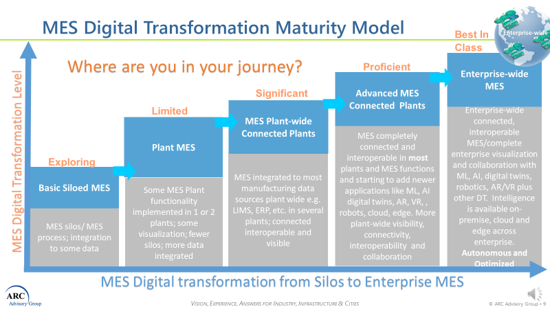 ARC đã phát triển một mô hình trưởng thành Chuyển đổi số Nhiều cấp độ cho cuộc khảo sát MES này để giúp các tổ chức người dùng cuối xác định vị trí của họ trong hành trình Chuyển đổi số tương ứng so với các tổ chức ngang hàng. Các câu hỏi khảo sát đều liên quan đến mô hình Nhiều cấp độ này, tiến triển từ thăm dò ban đầu, ứng dụng hạn chế, ứng dụng quan trọng, ứng dụng thành thạo và cuối cùng là tốt nhất trong lớp.