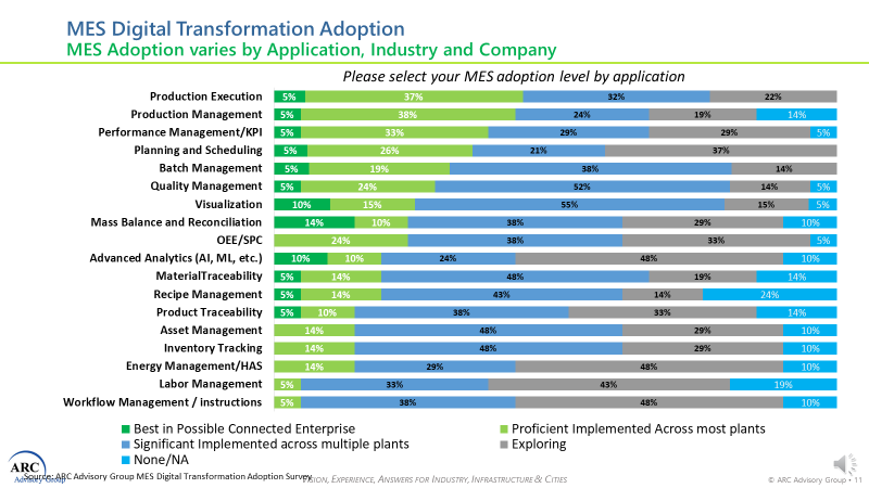 Thực hiện sản xuất, quản lý sản xuất, quản lý hiệu suất và lập kế hoạch và lập kế hoạch có mức độ áp dụng cao nhất trong các nhà máy có hiệu suất cao. Quản lý quy trình làm việc, quản lý lao động và năng lượng có mức độ áp dụng ít nhất. ARC tin rằng điều này có thể bởi vì, trong khi quan trọng, các ứng dụng này thường được bán và thực hiện riêng biệt với MES.