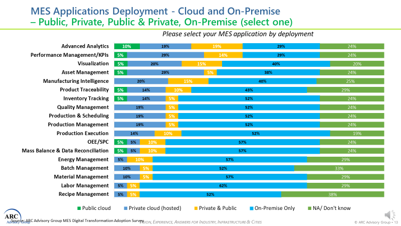 Như biểu đồ cho thấy, nhóm người trả lời lớn nhất vẫn thích giữ các ứng dụng MES quan trọng của họ tại chỗ. Lời hứa của Đám mây tăng lên (cùng với những cải tiến hơn nữa trong an ninh mạng cloud và niềm tin của người dùng liên quan), ARC tin rằng điều này có khả năng thay đổi trong tương lai. Tuy nhiên, ARC cũng tin rằng, trong một số ngành nhất định, một số ứng dụng sẽ vẫn tồn tại vĩnh viễn do bản chất của bản thân ứng dụng hoặc các vấn đề pháp lý, quy định và / hoặc sở hữu trí tuệ.