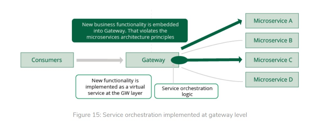 Ví dụ, Hình 14 mô tả một kịch bản trong đó chúng ta có một vài microservices là A, B, C và D. Bây giờ chúng tôi muốn đưa ra một chức năng mới đòi hỏi phải gọi microservice A và C một cách tuần tự và cung cấp một phản hồi tổng hợp. Để làm điều này, chúng ta có thể xây dựng một microservice mới (microservice E) và logic phối hợp có chứa dịch vụ gọi A và C được nhúng vào microservice E. Tất cả các yêu cầu của microservice được thực hiện thông qua cổng gateway. Nếu microservice E phải được scale một cách độc lập, điều đó có thể được thực hiện bằng cách scale microservice E, A và C theo yêu cầu.