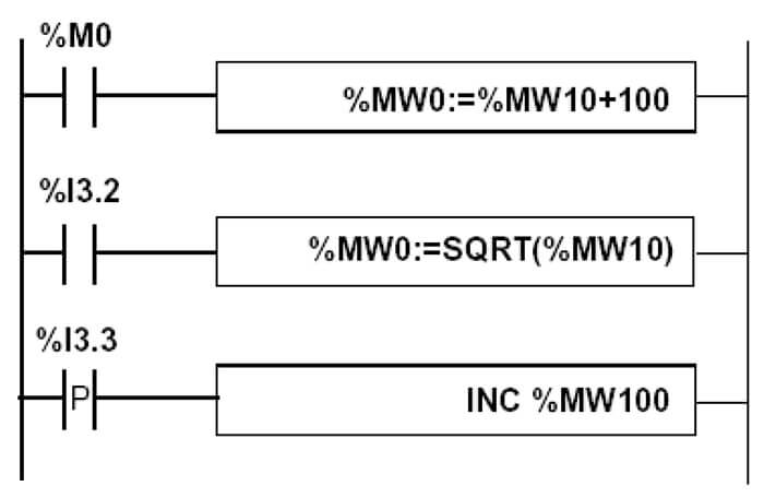 Mặc dù ví dụ này chỉ là một phần của chương trình (biến INPUT1 đại diện cho một đầu vào và OUTPUT1 là một đầu ra), nó minh họa cách thức đưa ra quyết định cho đầu ra PLC. Biến OUTPUT1 sẽ chỉ được đặt thành TRUE NẾU biến INPUT1 là TRUE.