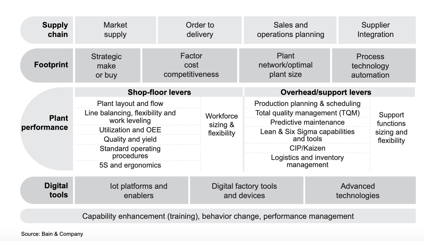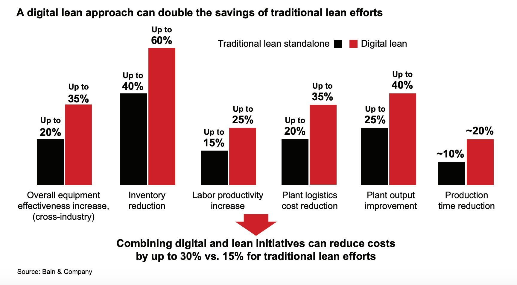 Kinh nghiệm cá nhân cho thấy các hệ thống hiệu suất LEAN được thiết lập tốt, những người đang mô tả các nguyên tắc, phương pháp và công cụ có thể cải thiện hoạt động khoảng 3-5% mỗi năm. Bản chất của các nguyên tắc tinh gọn là lái xe, như đã nêu chương trình cải tiến liên tục ở mức phân cấp thấp nhất có thể. Ngày nay phần mềm và công nghệ thông tin được sử dụng một cách hạn chế hoặc sử dụng các hệ thống độc quyền không có kết nối với các chức năng, bộ phận hoặc thậm chí là nhà máy khác. Trong lĩnh vực này, cần phải suy nghĩ lại để tham gia từ các lợi ích giải pháp kỹ thuật số trong tương lai.