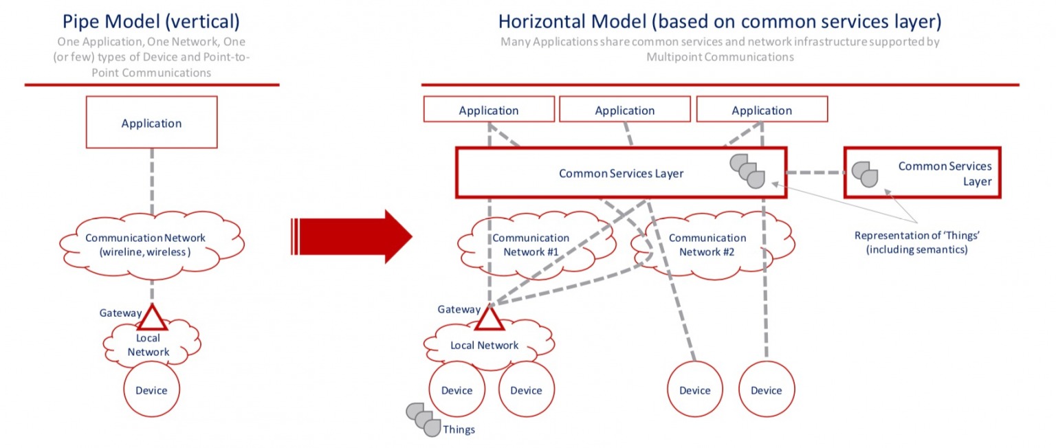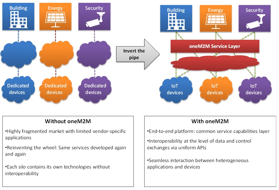 Để giải quyết vấn đề, kiến trúc oneM2M áp dụng mô hình ngang dựa trên khung dịch vụ chung. Ví dụ về các dịch vụ phổ biến bao gồm chức năng quản lý thông tin liên lạc, quản lý thiết bị và bảo mật. Kiến trúc này cũng có nghĩa là các thiết bị và dữ liệu của chúng đều có thể khám phá và truy cập được đối với nhiều ứng dụng mẹ duy nhất. Các ứng dụng có thể được xây dựng bằng cách sử dụng các thiết bị hỗ trợ oneM2M có nguồn gốc từ nhiều nhà cung cấp, giảm nguy cơ vendor lock-in. Điều này cho phép các nhà cung cấp giải pháp chỉ xây dựng một lần và sử dụng lại nhiều lần. Đây là một lợi thế đáng kể khi thiếu tiêu chuẩn hạn chế hoán vị giữa nhiều nhà cung cấp công nghệ, nhà cung cấp dịch vụ, ranh giới tổ chức và các ứng dụng IoT.