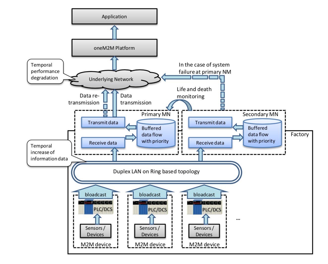 Trong các nhà máy, rất nhiều dữ liệu được tạo ra từ PLC mỗi giây và dữ liệu được sử dụng để giám sát dây chuyền sản xuất. Dữ liệu này có sẵn thông qua hệ thống xe buýt công nghiệp, ví dụ: Ethernet thời gian thực. Loại dữ liệu này được gọi là dữ liệu chuỗi thời gian, là một chuỗi các điểm dữ liệu, thường bao gồm các phép đo liên tiếp được thực hiện trong một khoảng thời gian. Để giám sát từ xa, dữ liệu được thu thập bởi nền tảng dịch vụ oneM2M cần giao tiếp với các hệ thống bus công nghiệp thông qua gateway M2M (MN).