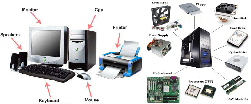 Phần cứng máy tính (Computer Hardware) thì tùy vào loại máy tính mà có các thành phần chính như: CPU, RAM, Ổ cứng, Màn hình, Bộ nguồn, Ổ đĩa quang, Card mạng/đồ họa/âm thanh, Bo mạch chủ, Thùng máy, Bàn phím, Chuột, Máy in,..