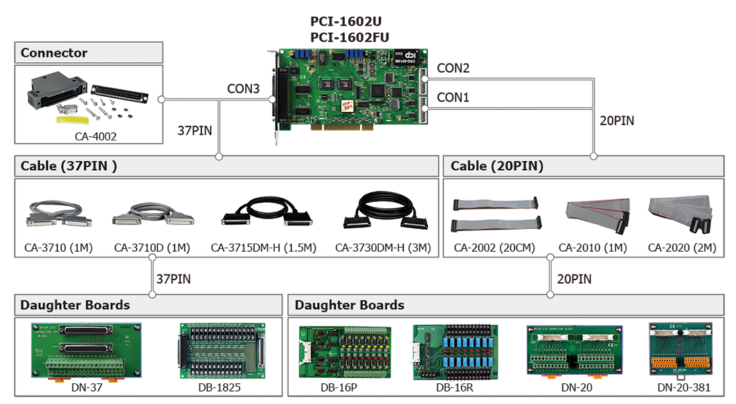 | PCI-1602FU/S CR | Universal PCI, 200 kS/s, 32-ch, 16-bit AI Multifunction Board (8 K word FIFO) (RoHS) Includes one CA-3710 D-Sub cable |