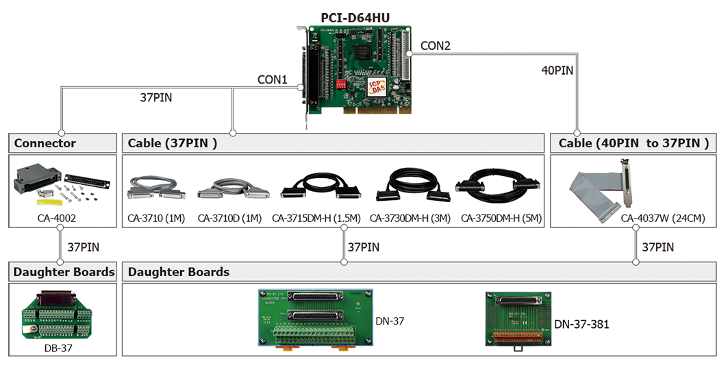 | PCI-D64HU CR | Universal PCI, 40 MB/s, 64-ch Digital I/O Board (RoHS) Includes one CA-4037W cable and two CA-4002 D-Sub connectors |