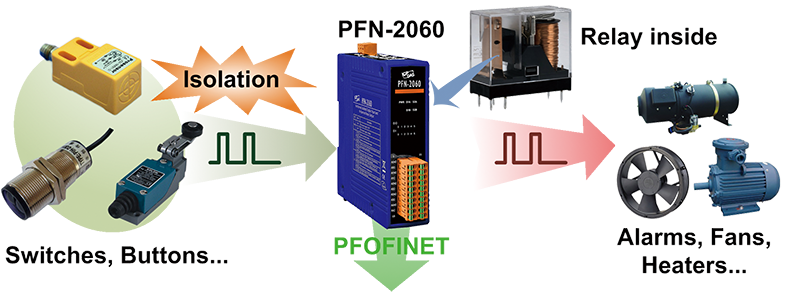 The PFN-2060 is specially designed for PROFINET IO device. It has 6-channel isolated digital inputs and 6-channel relay outputs, and is suited in various industrial applications. You can access and configure it by using the GSDML file in any PROFINET Engineering tool.