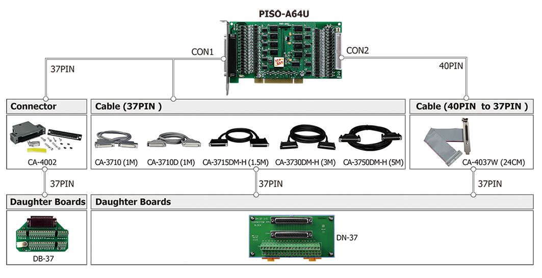 | PISO-A64U CR | Universal PCI, 64-ch Open Collector Isolated (Source, PNP) DO Board Includes one CA-4037B cable and two CA-4002 D-Sub connectors |