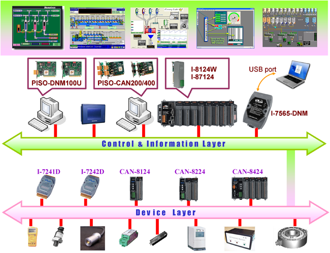 Besides, PISO-DNM100U uses the CAN controller Phillips SJA1000T and transceiver 82C250, which provide bus arbitration, error detection with auto correction and re-transmission function.It can be installed on almost any windows-based system, for example Windows system. It is popularly applied in the industrial automation, building automation, vehicle, marine, and embedded control network. In order to expand the DeviceNet functions of ICPDAS products, PISO-DNM100U is developed for this purpose.