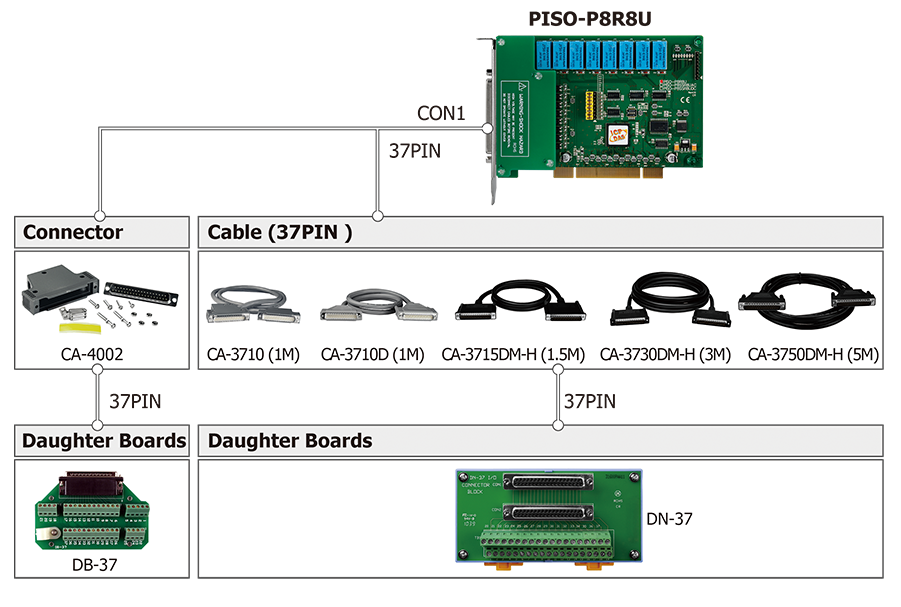 | PISO-P8R8U CR | Universal PCI, 8-ch Isolated DI and 8 Relay Output Board (RoHS) Includes one CA-4002 D-Sub connector |